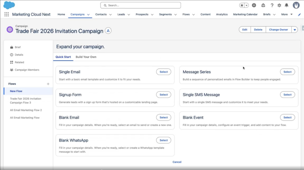 Das, was bisher in Pardot als Engagement Programme oder in der klassischen Marketing Cloud als Journey Builder umgesetzt wurde, wird hier über sogenannte Kampagnen-Flows abgebildet.